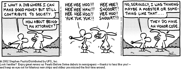 Hahahahahahaha! I worked in a corporate law firm for years, in the bankruptcy department none the less. When our Chapter 11 Debtor was having a cooling system put in his bedroom, because the 24kt gold leaf paint was starting to peel, I began to think “something seems odd about this.” Lawyers get a bad rap. I look at it this way…If you’re in trouble, you’re going to look for the most clever thinker on deck.
